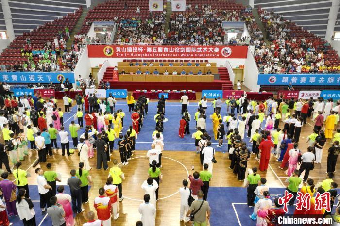 8月17日,黄山建投杯·第五届黄山论剑国际武术大赛在安徽省黄山市体育馆开幕,吸引韩国、越南、马里等11个国家和地区以及中国18个省市的100支代表队1329名武术爱好者报名参赛。图为比赛开幕式现场。樊成柱 摄