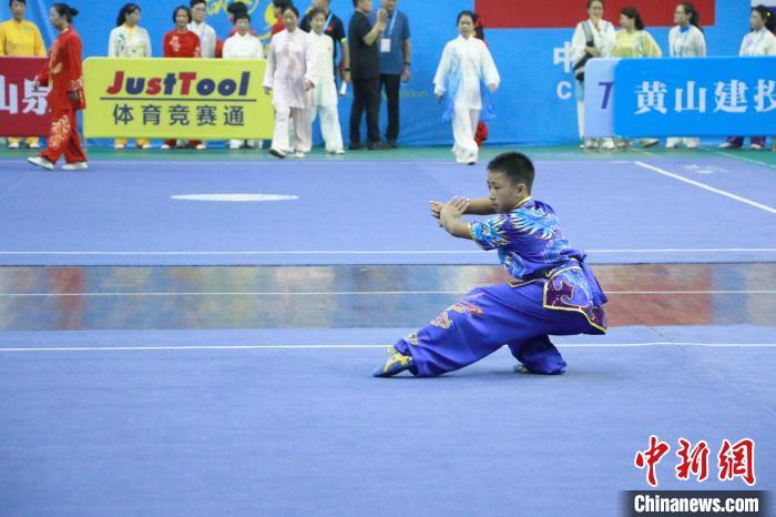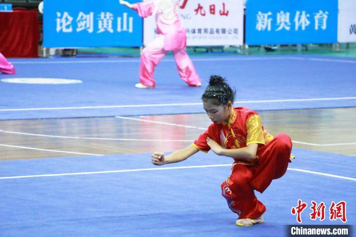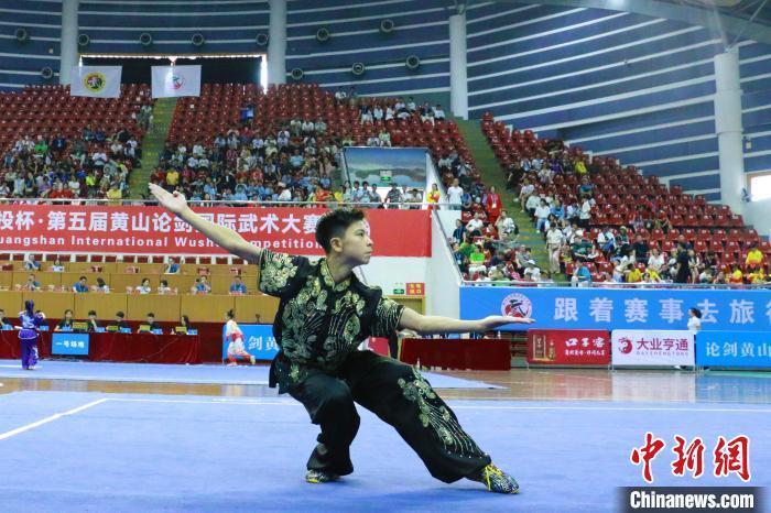 8月17日,黄山建投杯·第五届黄山论剑国际武术大赛在安徽省黄山市体育馆开幕,吸引韩国、越南、马里等11个国家和地区以及中国18个省市的100支代表队1329名武术爱好者报名参赛。图为一名选手在展示武术技艺。中新社记者 张强 摄