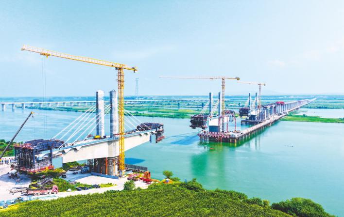8月16日,襄荆高铁控制性工程宜城汉江特大桥已完成全部主塔封顶,全力冲刺10月合龙目标。(湖北日报全媒记者 田悦 通讯员 谢勇 摄)