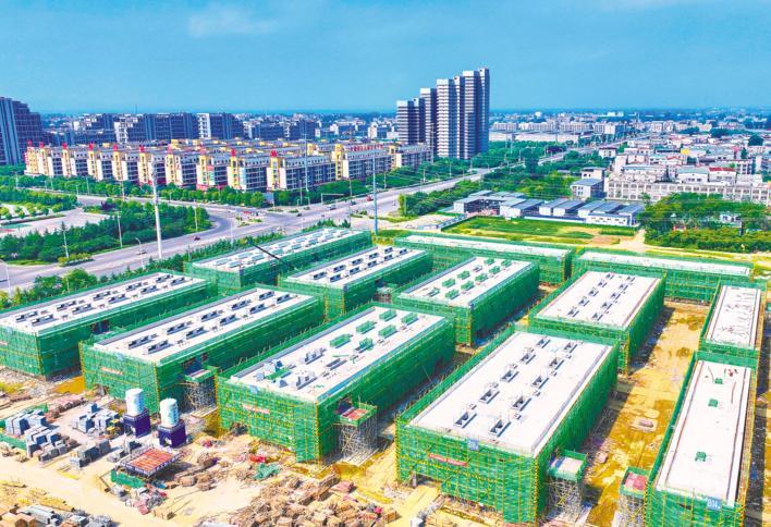 3栋厂房初具雏形,工人们有序地浇筑混凝土、绑扎钢筋,现场一片忙碌。