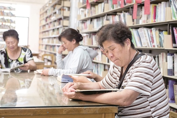 像往常一样,70岁的胡秋芳和邻居袁先桃一起,走进图书馆,翻阅新到的书籍。