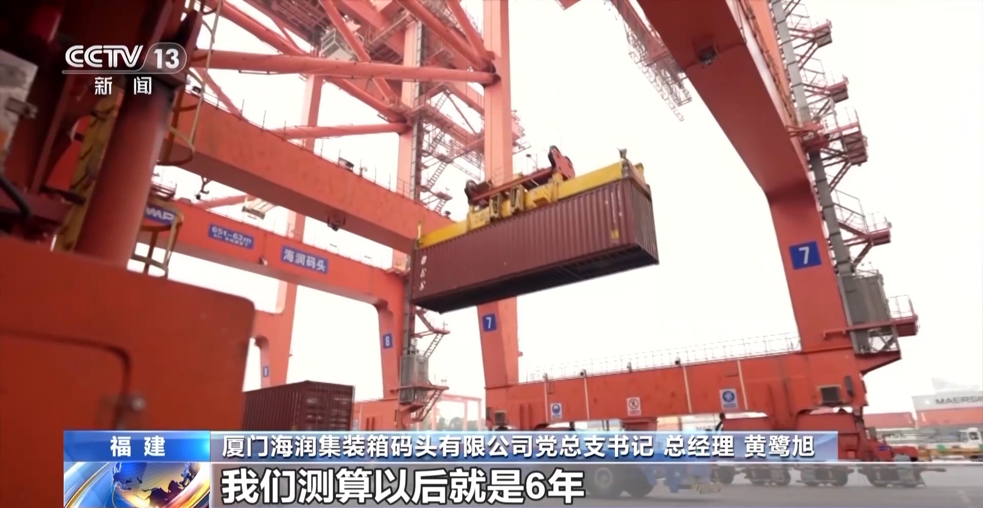 厦门海润集装箱码头有限公司党总支书记 总经理 黄鹭旭:我们龙门吊的发动机,原来通常的折旧年限是15年。现在换了锂电池以后,它的动力成本可能只有原来用燃油的一半不到。我们测算,6年投入就能全部收回来了,非常划算,它是一个社会效益跟经济效益双赢的结果。