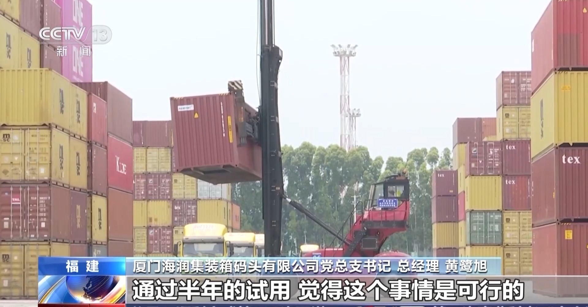 厦门海润集装箱码头有限公司党总支书记 总经理 黄鹭旭:我们一开始在做绿色港口建设的时候,特别是电动堆高机的投入,采用另外一种比较稳妥的办法,就是租赁,没有直接买。通过半年的试用,觉得这个事情是可行的,所以在整个厦门港务所属的码头进行全面的推广。