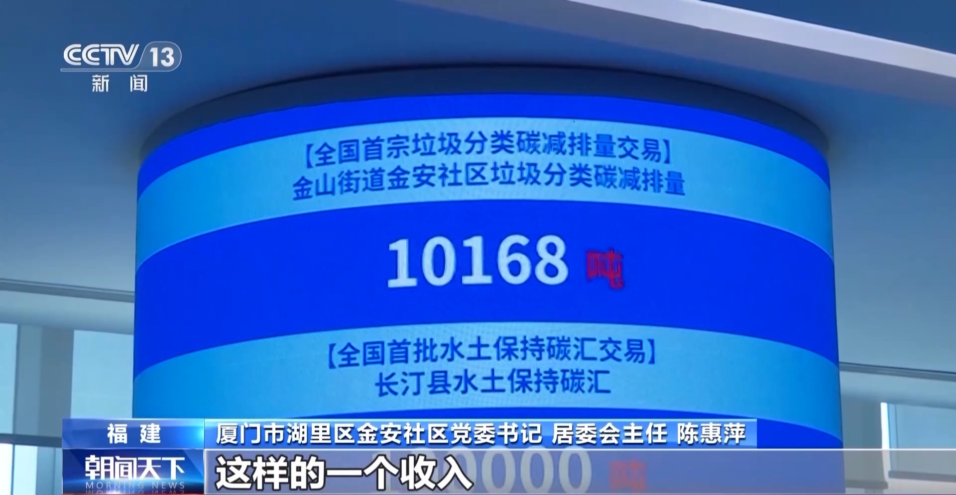 厦门市湖里区金安社区党委书记 居委会主任 陈惠萍:根本就没办法想象,垃圾分类还能够形成我们的碳资产可以上市的,大家也都很开心,第一次收到这沉甸甸的7万多元的收入。