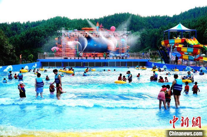 图为游客聚集在天门山社区农文旅综合体的水上乐园造浪池享受冲浪乐趣。王成前 摄