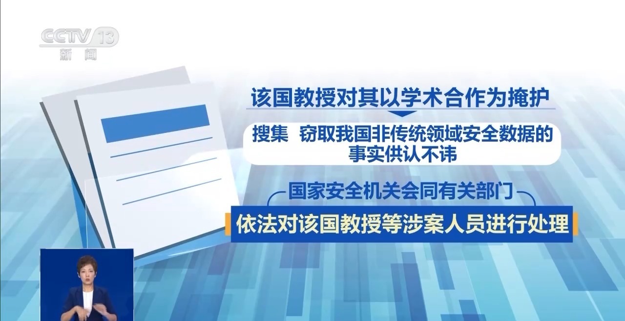 根据线索,国家安全机关会同有关部门迅速开展工作,及时制止了非法活动。该国教授对其以学术合作为掩护,搜集、窃取我国非传统领域安全数据的事实供认不讳。国家安全机关会同有关部门,依法对该国教授等涉案人员进行处理。