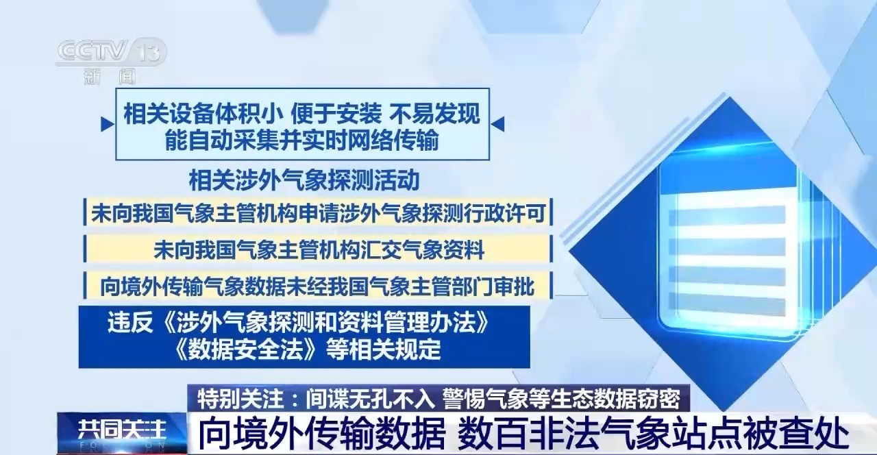 相关设备体积小、便于安装、不易发现,能自动采集并实时网络传输。相关涉外气象探测活动,未向我国气象主管机构申请涉外气象探测行政许可,未向我国气象主管机构汇交气象资料,向境外传输气象数据未经我国气象主管部门审批,违反《涉外气象探测和资料管理办法》《数据安全法》等相关规定。