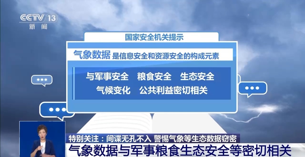 国家安全机关提示,气象数据作为基础数据,是信息安全和资源安全的构成元素,与军事安全、粮食安全、生态安全、气候变化、公共利益密切相关。