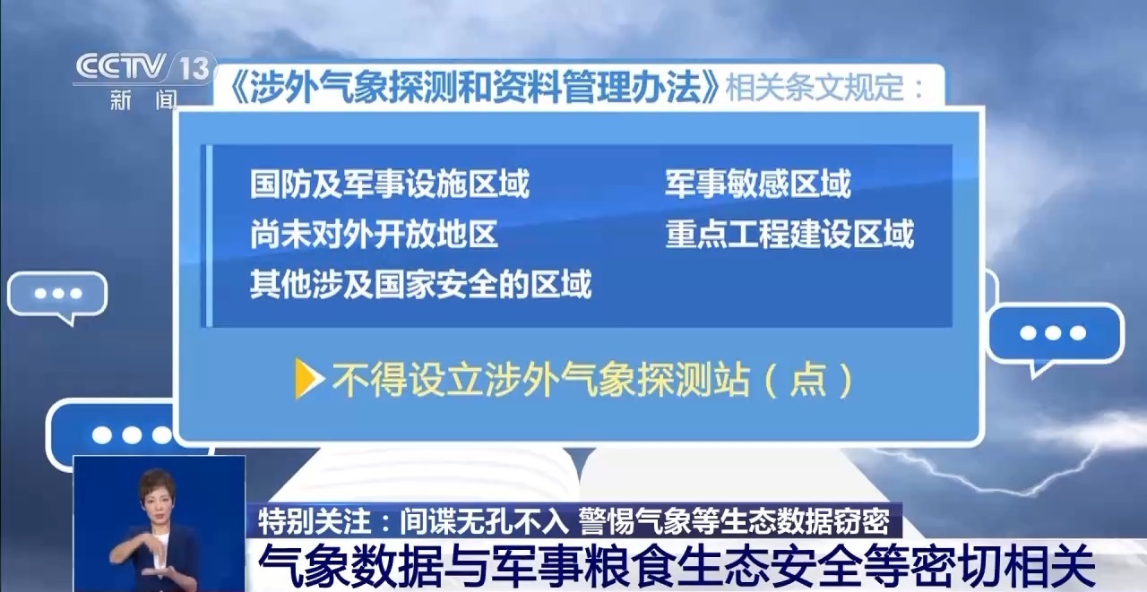 我国《涉外气象探测和资料管理办法》相关条文规定:国防及军事设施区域、军事敏感区域、尚未对外开放地区、重点工程建设区域及其他涉及国家安全的区域,不得设立涉外气象探测站(点)。