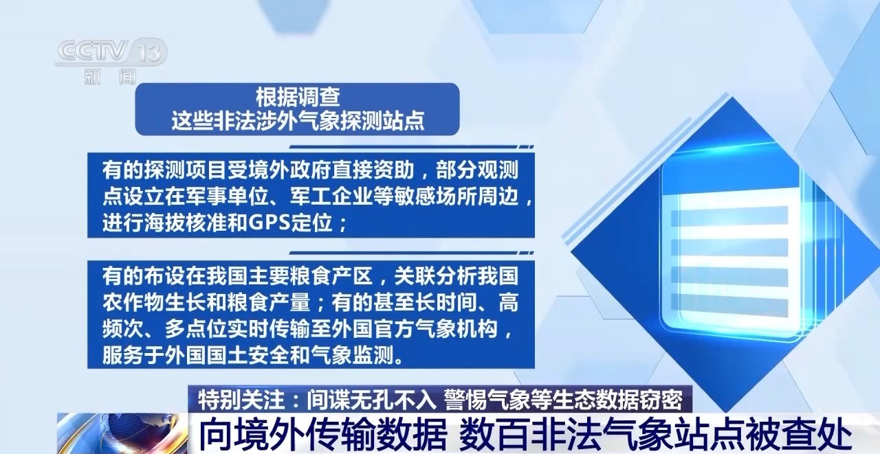 根据调查,这些非法涉外气象探测站点,有的探测项目受境外政府直接资助,部分观测点设立在军事单位、军工企业等敏感场所周边,进行海拔核准和GPS定位;有的布设在我国主要粮食产区,关联分析我国农作物生长和粮食产量;有的甚至长时间、高频次、多点位实时传输至外国官方气象机构,服务于外国国土安全和气象监测。