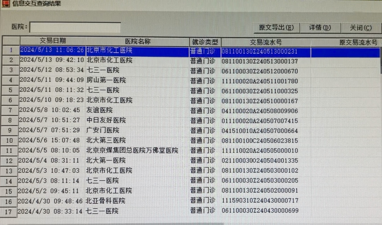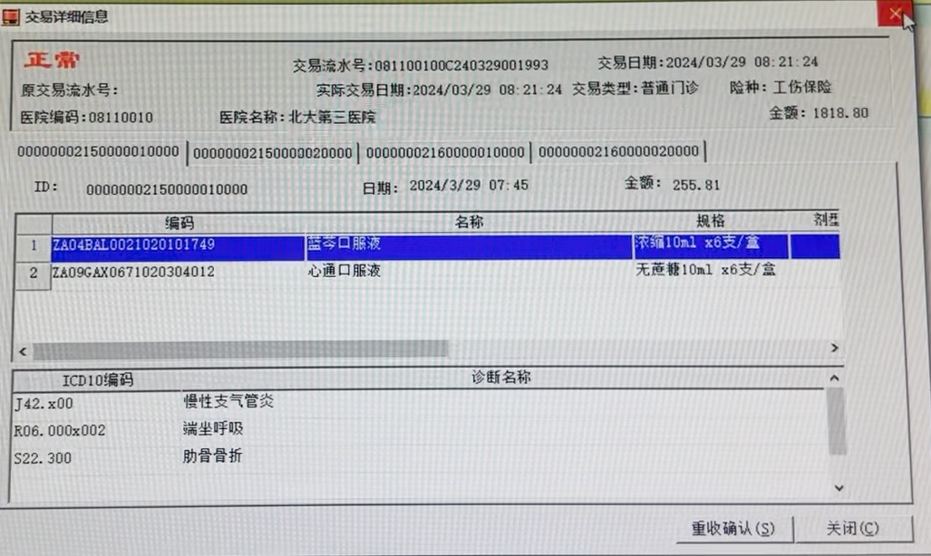 通过北京多家医院的信息共享,记者看到,从2024年2月6日至5月13日,患者王某某共104次到北京各大医院的门诊开药。以4月份为例,仅在4月3日一天,王某某就去了三家医院:上午8时去了中国中医科学院广安门医院,9时30分前往航天七三一医院,下午2时30分在北京燕化医院,行程近50公里,分别开具了价值827元、686元和1199元的药物,“诊断”包含锁骨骨折、行走困难、胸部损伤、支气管哮喘、煤炭工肺尘埃沉着病等。4月4日,该患者又来到北京市化工职业病防治院开具5张处方共1319元,4月6日在中日友好医院开具2张处方共1824元,4月7日在北大第一医院开具2张处方共1020元……王某某几乎每天都去医院开药,付费的都是“工伤保险”。药品既有碳酸钙D3、蓝芩口服液、感冒清热颗粒这样的非处方药,也有如意珍宝丸、肺力咳合剂、洛索洛芬钠等处方药。