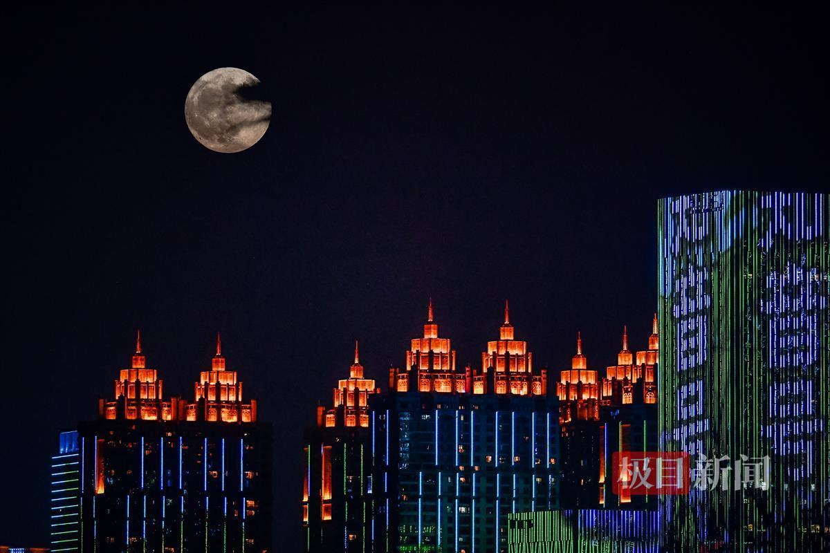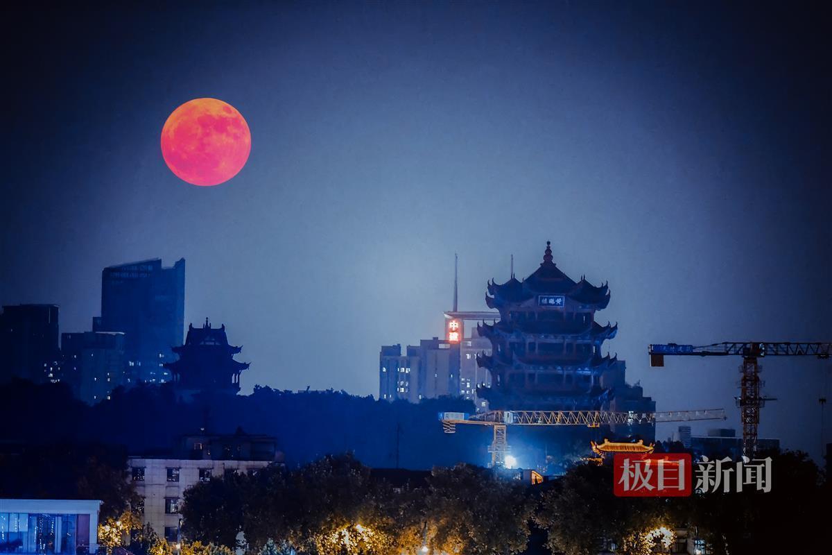 随着夜幕降临,超级红月亮逐渐升高,其色彩也由鲜红转为明亮的银白,继续照亮着武汉的夜空。