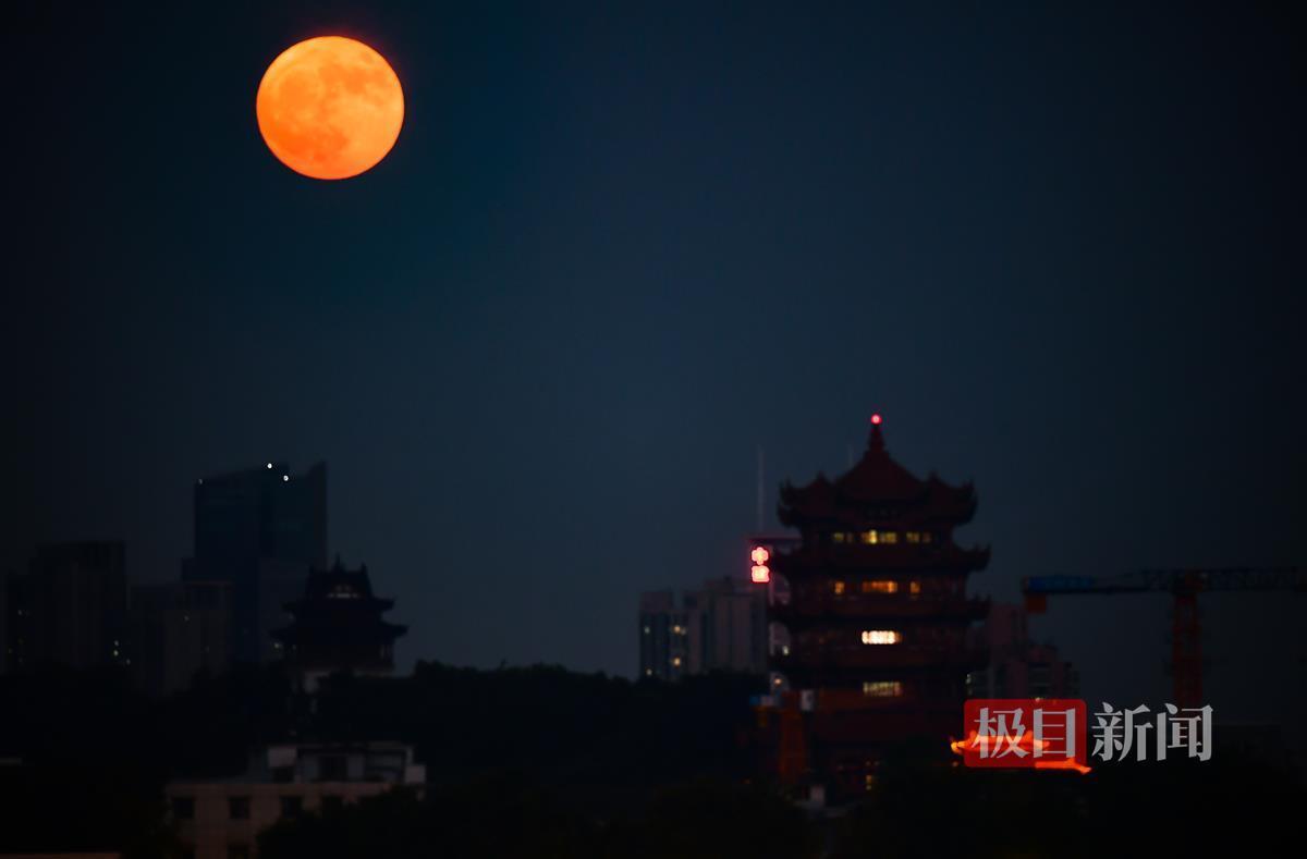 尽管白天的一场大雨为夜空铺上了厚重的乌云幕布,但并未阻挡超级红月亮的璀璨绽放。它如同一位羞涩的使者,从层层叠叠的云层中顽强地探出头来,展现出令人震撼的美。记者现场看到,超级红月亮初升之时,几乎与黄鹤楼楼体相当,这一幕实属罕见,引人入胜。