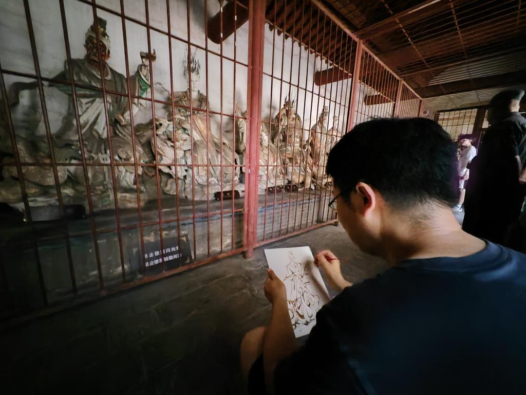 来自西安的游客正在二十八星宿殿内写生。新华社记者 解园 摄