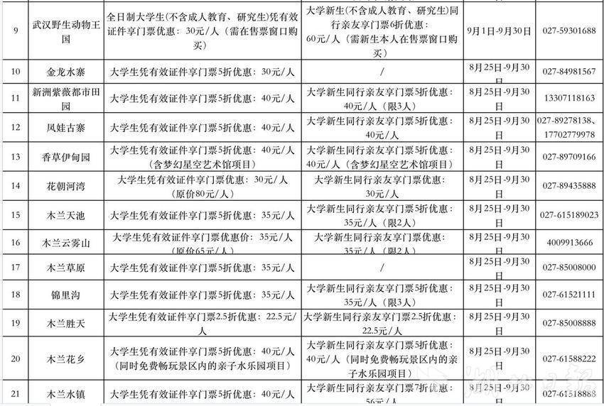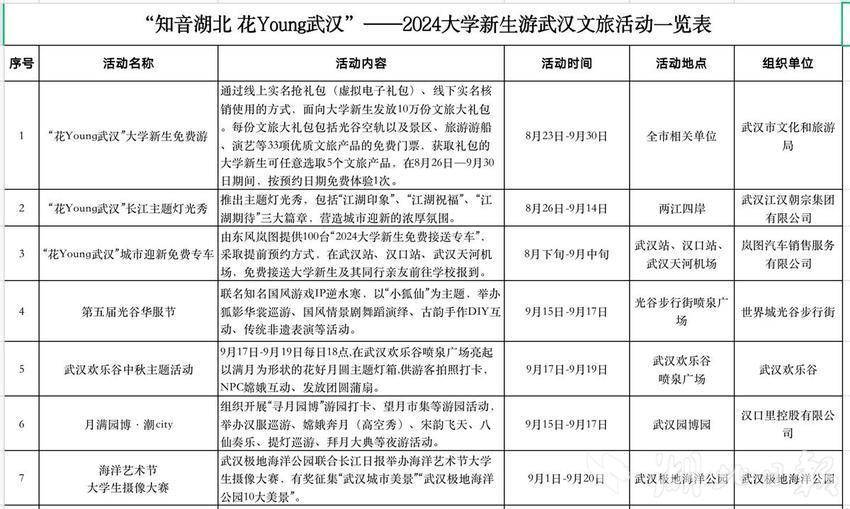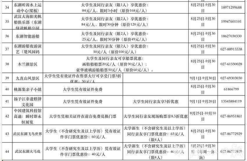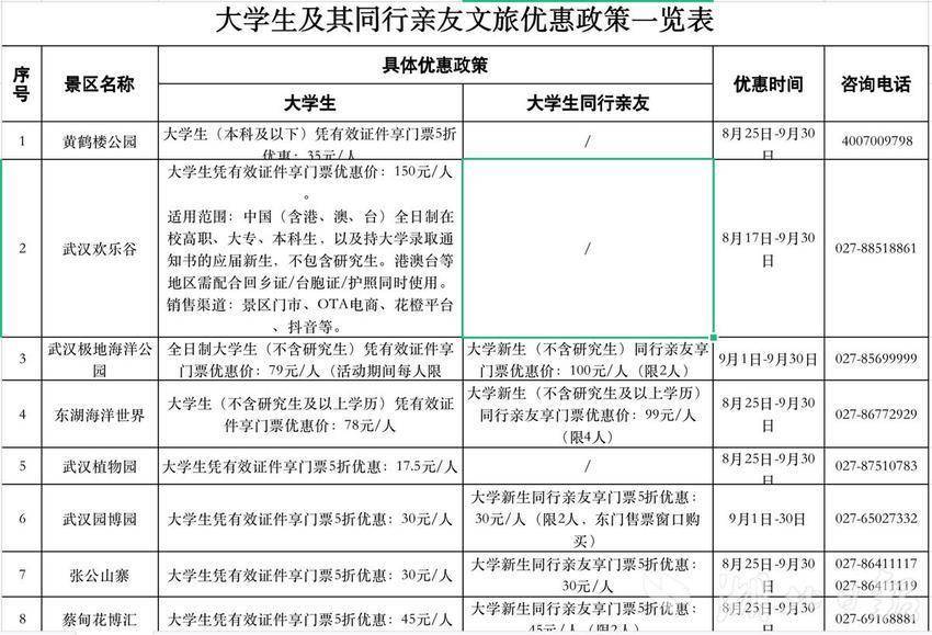 8月下旬至9月底,相关景区、商超、餐饮、住宿等企业和平台,针对大学新生及其亲友的系列优惠措施。比如,黄鹤楼、欢乐谷等40多家文旅企业推出5折专属优惠,部分景区(点)推出2.5折特价优惠甚至免票福利。市商务局开展“青春食光——百万大学生畅享名菜名点”活动,组织武汉地方特色餐饮企业面向大学新生推出江城“十大名菜、十大名点”打折优惠。