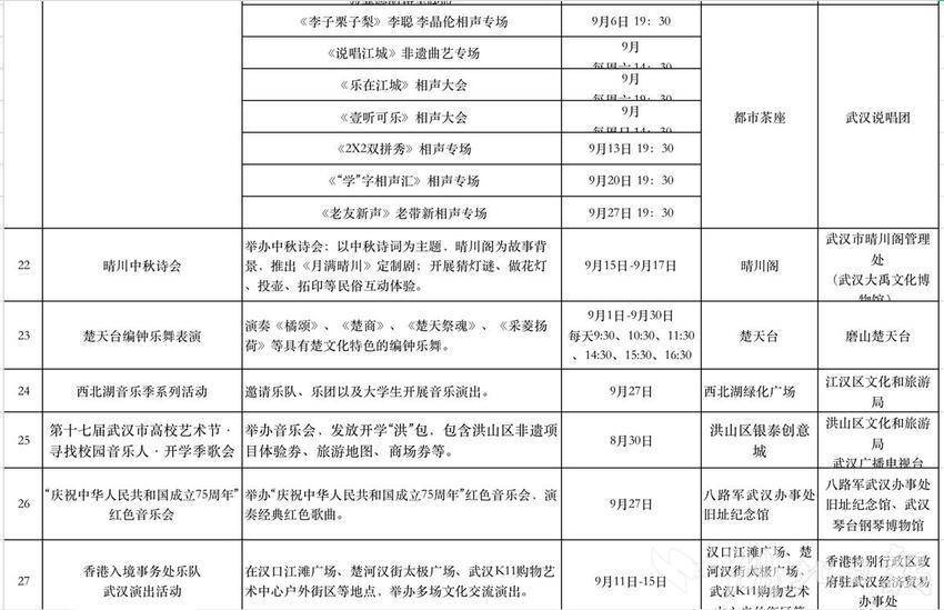 此外,还将在武汉大学、中国地质大学、中南民族大学、湖北工业大学、武汉体育学院、汉口学院等高校,设置武汉文旅迎新宣传点,欢迎各位新同学。