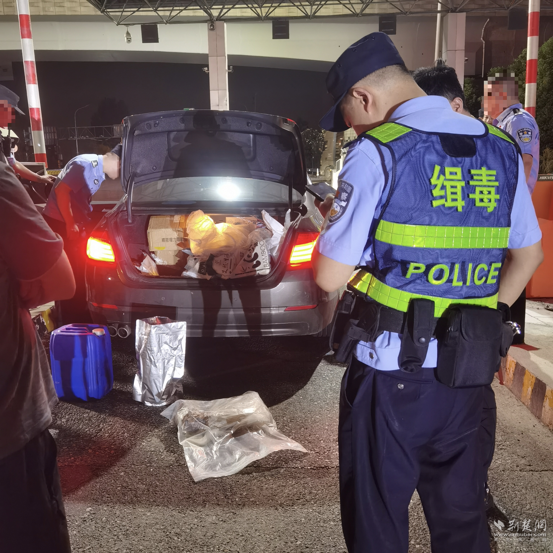 8月11日深夜23时,一辆黑色轿车驶入卡点,黄陂区公安分局新河桥检查站民警将车辆拦停,禁毒支队民警打开车辆后备箱,发现塑料桶和锡箔纸袋内装有大量可疑化学品,据司机交代,这些可疑化学品为“替来他明”。“替来他明”是一种兽用麻醉剂,因其具有强烈的致幻作用,常被不法分子作为毒品替代品使用,对人体健康危害极大。目前案件正在进一步侦办中。