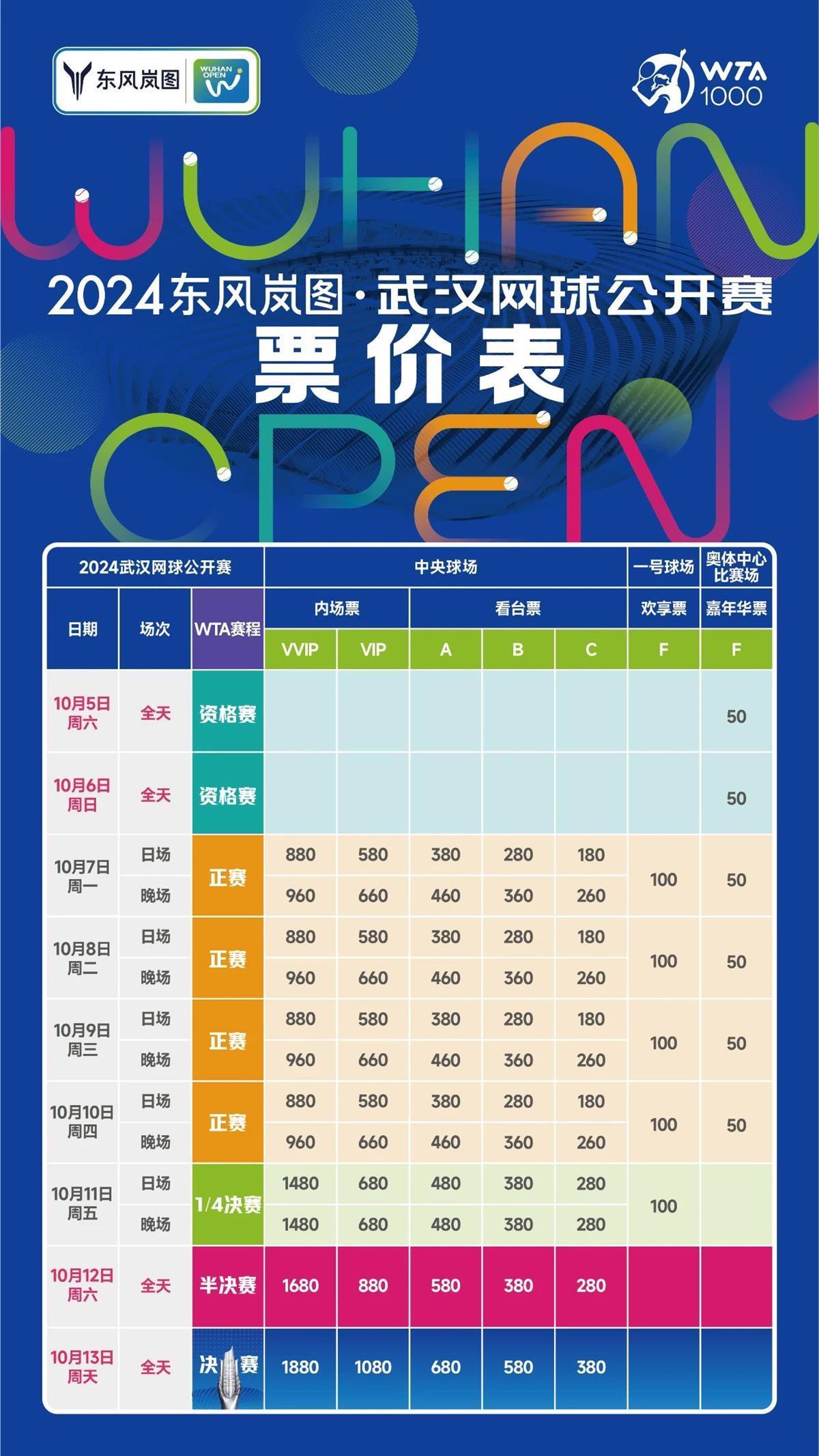 开票仪式现场介绍,今年武网公开赛在武汉光谷国际网球中心举办,赛期为10月5日至10月13日,其中前两日为资格赛,后7日为正赛,比赛场次多达106场。本次比赛有嘉年华票、欢享票与中央球场球票等多种票型。中央球场内场票价格从580元到1880元不等,看台票价格从180元到680元不等,分为日、晚场,半决赛及决赛不分日晚场。另有1号球场欢享票100元,奥体中心比赛场嘉年华票(2/3/4/5号球场)50元。