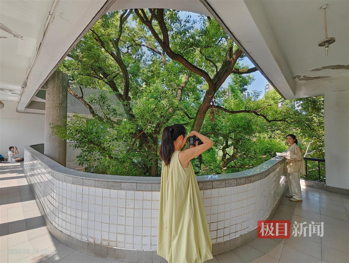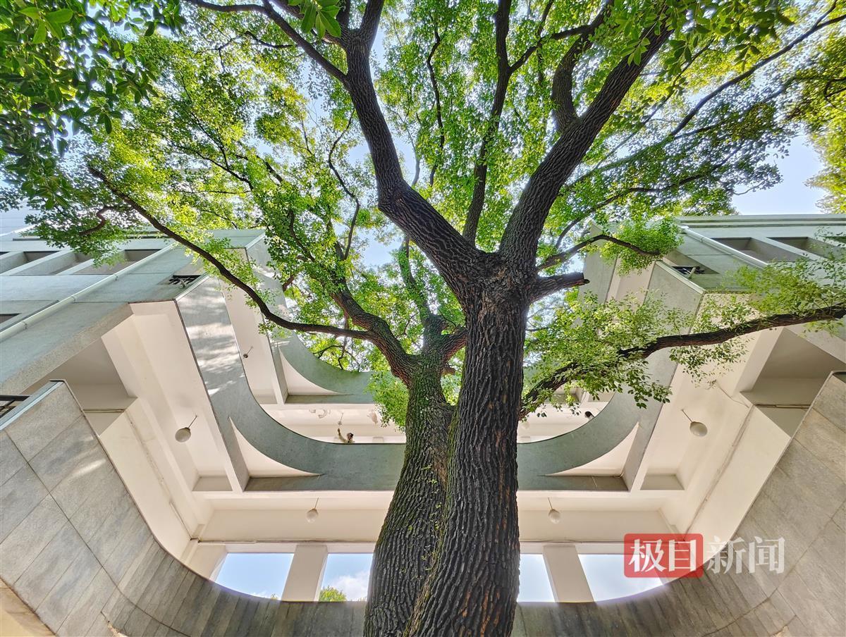 这棵近20米高的樟树位于湖北美术学院昙华林校区2号综合楼的天井内。记者在现场看到,这棵樟树在底部分成了两枝。一枝向天空挺进近20米,已高过了楼顶;而另一枝则向西侧的湖面倾斜,树冠茂盛。肆意伸展的绿荫与通透明朗的走廊相映成趣,随手一拍便是一幅电影感画面。