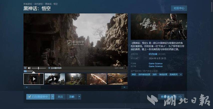 8月20日,国产游戏《黑神话:悟空》上午10时全球同步上线。截至晚上7时,该游戏在知名游戏平台“Steam”收获45949条用户评论,游戏测评显示“好评如潮”,好评率达到96%。(注:用户需购买268元基础版或328元数字豪华版才能取得测评资格)