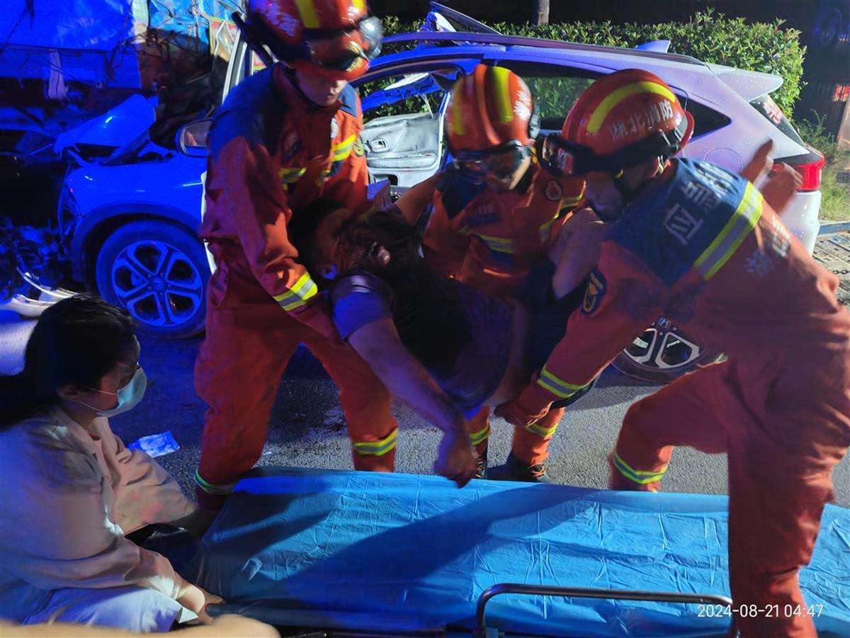 8月21日凌晨4时14分,湖北省黄冈市黄梅县小池镇五环路中国石化加油站附近发生一起车祸,一辆轿车追尾一辆大货车,轿车司机腿部被卡无法脱身,黄梅县消防救援大队到达现场后,耗时约20分钟,成功将被困司机救出并送医治疗。