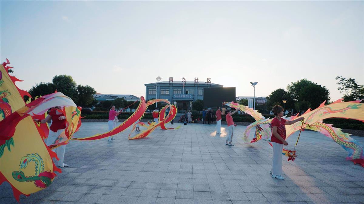 居民在同心社区党员群众服务中心门口舞龙