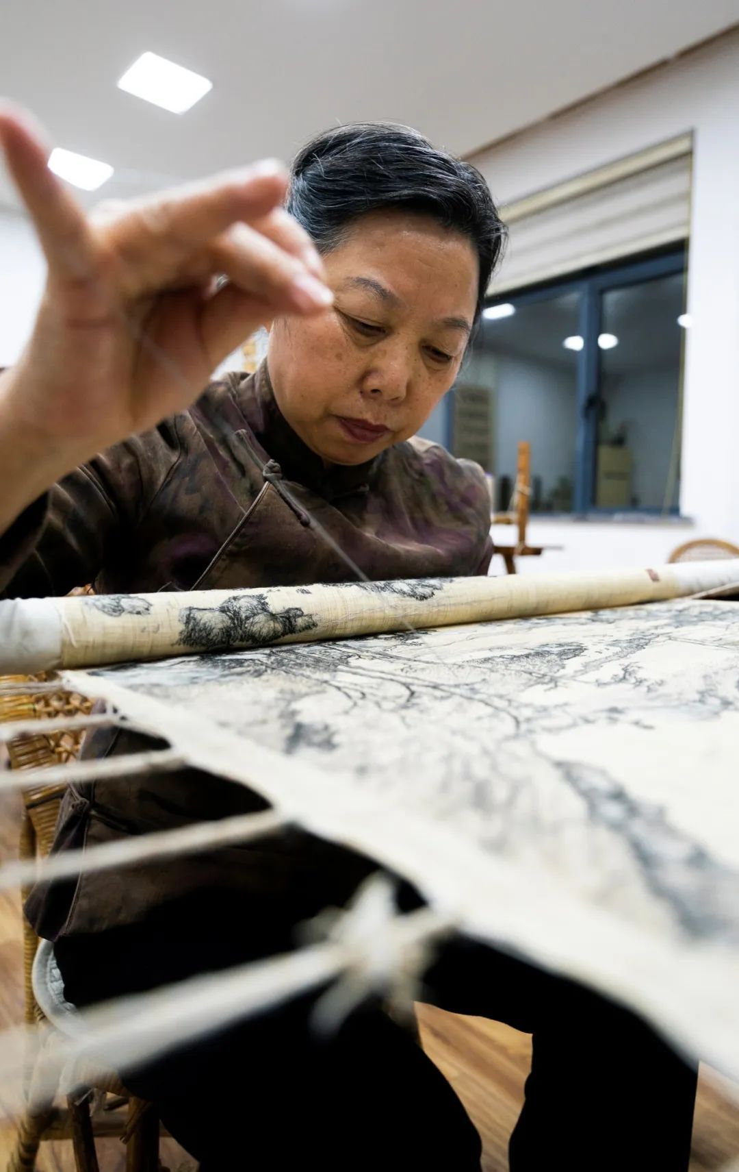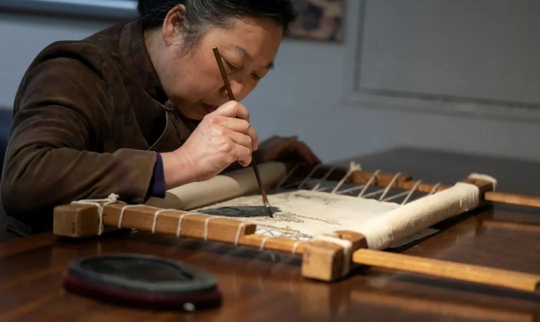 飞针、挑线、顶托……66岁的张小红,坐在绷架前,比对着名家山水画,一面看,一面绣,揣摩如何让画中景致复现在一块夏布上。