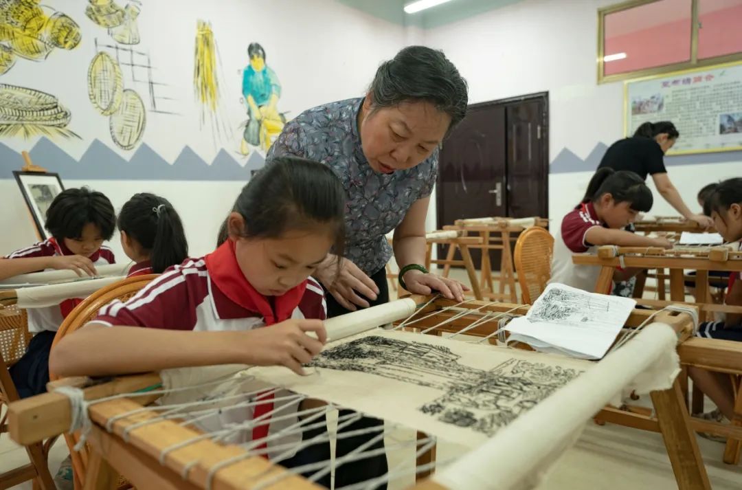 国家级非物质文化遗产代表性项目代表性传承人张小红指导渝水区仙来学校的小学生学习夏布刺绣。 赵春亮 摄