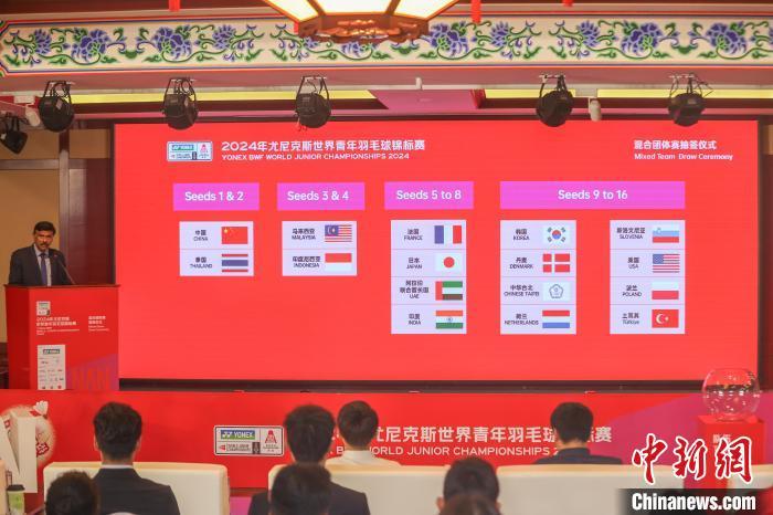 8月22日,2024年尤尼克斯世界青年羽毛球锦标赛混合团体赛抽签仪式在江西南昌举行,根据现场抽签结果,中国国家队与韩国队、澳大利亚队、中国香港队,加纳队同分在A组。本次赛事将于9月30日至10月13日在南昌举行,来自40个国家和地区的代表队参赛。图为抽签仪式现场,世界羽联赛事经理维努介绍种子队伍名单。中新社记者 刘力鑫 摄
