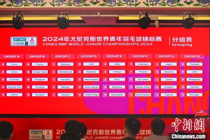 8月22日,2024年尤尼克斯世界青年羽毛球锦标赛混合团体赛抽签仪式在江西南昌举行,根据现场抽签结果,中国国家队与韩国队、澳大利亚队、中国香港队,加纳队同分在A组。本次赛事将于9月30日至10月13日在南昌举行,来自40个国家和地区的代表队参赛。图为抽签仪式现场大屏幕公布的抽签结果。中新社记者 刘力鑫 摄