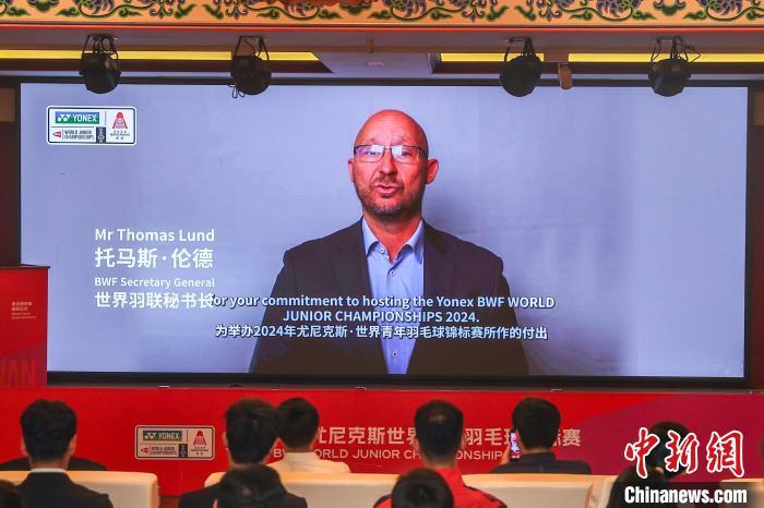 8月22日,2024年尤尼克斯世界青年羽毛球锦标赛混合团体赛抽签仪式在江西南昌举行,根据现场抽签结果,中国国家队与韩国队、澳大利亚队、中国香港队,加纳队同分在A组。本次赛事将于9月30日至10月13日在南昌举行,来自40个国家和地区的代表队参赛。图为抽签仪式现场,世界羽联秘书长Thomas Lund发表视频致辞。中新社记者 刘力鑫 摄
