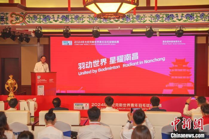 8月22日,2024年尤尼克斯世界青年羽毛球锦标赛混合团体赛抽签仪式在江西南昌举行,根据现场抽签结果,中国国家队与韩国队、澳大利亚队、中国香港队,加纳队同分在A组。本次赛事将于9月30日至10月13日在南昌举行,来自40个国家和地区的代表队参赛。图为抽签仪式现场公布本届赛事的官方宣传口号为“羽动世界 星耀南昌”。中新社记者 刘力鑫 摄