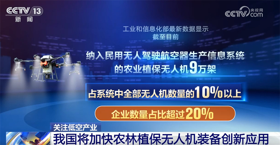 工业和信息化部的最新数据显示,我国农林植保无人机呈现较快发展势头,截至目前,纳入民用无人驾驶航空器生产管理信息系统的农业植保无人机9万架,占系统中全部无人机的10%以上,企业数量占比超过了20%。工业和信息化部相关负责人表示,我国将加快推动以无人机为代表的航空农林植保装备创新应用。