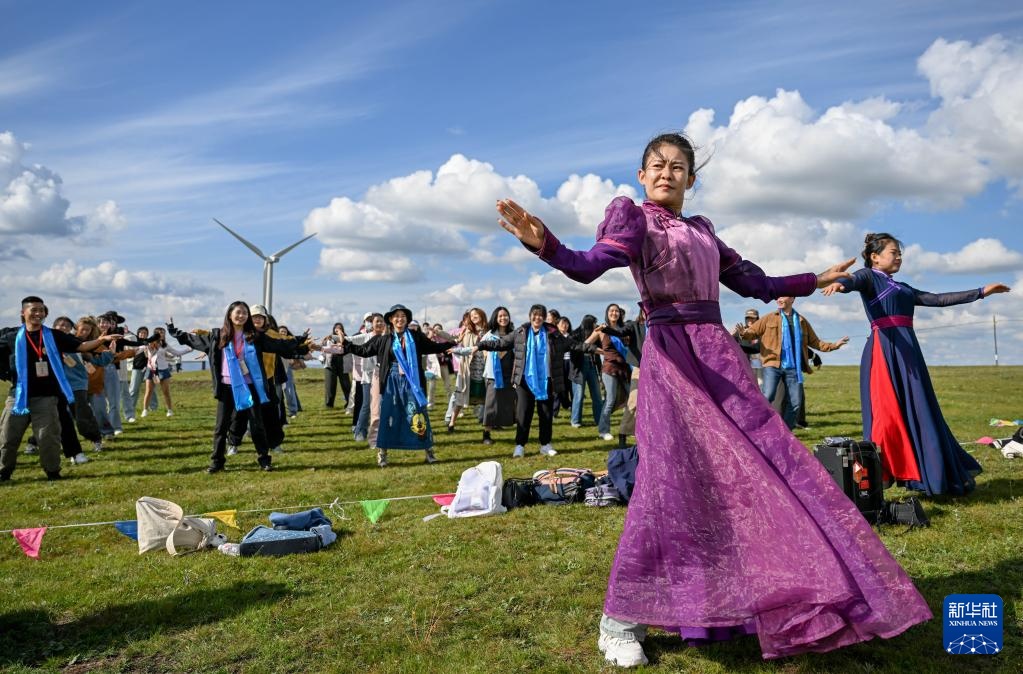 8月22日,参加第三十届海峡两岸大学生新闻营的师生们在内蒙古乌兰察布市辉腾锡勒草原学跳蒙古族舞蹈。当日,参加第三十届海峡两岸大学生新闻营的师生们走进内蒙古乌兰察布市辉腾锡勒草原,体验奶茶制作、搭建蒙古包等活动。据了解,第三十届海峡两岸大学生新闻营吸引了来自大陆10所高校和台湾8所高校的近200名大学生参与。新华社记者 连振 摄