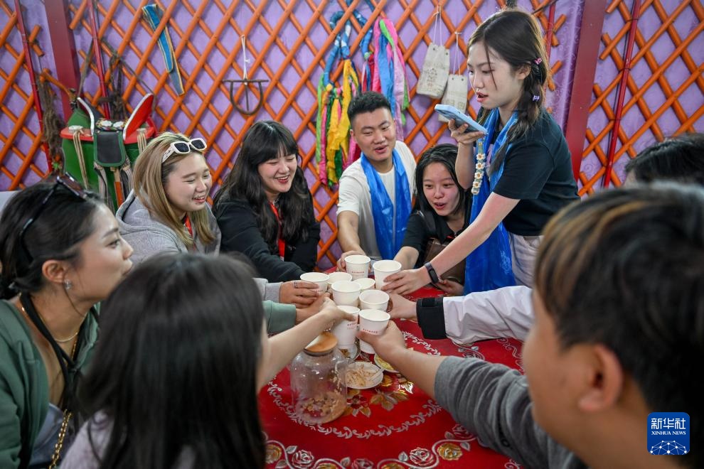 8月22日,在内蒙古乌兰察布市辉腾锡勒草原,参加第三十届海峡两岸大学生新闻营的师生在蒙古包里喝奶茶。新华社记者 连振 摄