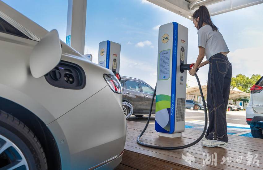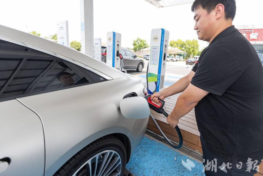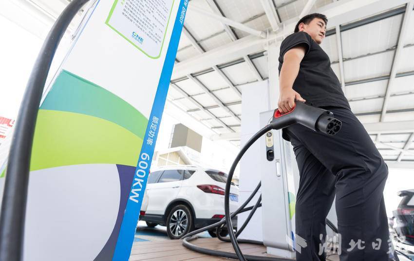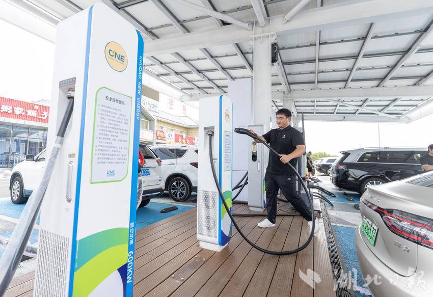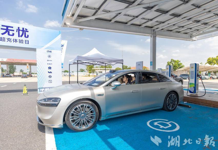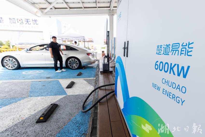 8月23日,福银高速孝感服务区,司机体验使用600KW功率的超级充电桩为新能源汽车充电。