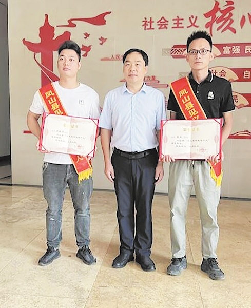 “提刀大侠”杨双(右)获表彰。受访者供图