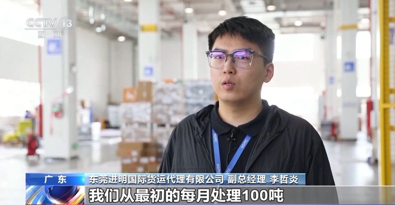 东莞进明国际货运代理有限公司 副总经理 李哲炎:自空港中心运行以来,我们从最初的每月处理100吨迅速提升到了当前的每月1000吨左右,业务量增长了10倍,为我们香港物流企业注入了强大的信心和动力。