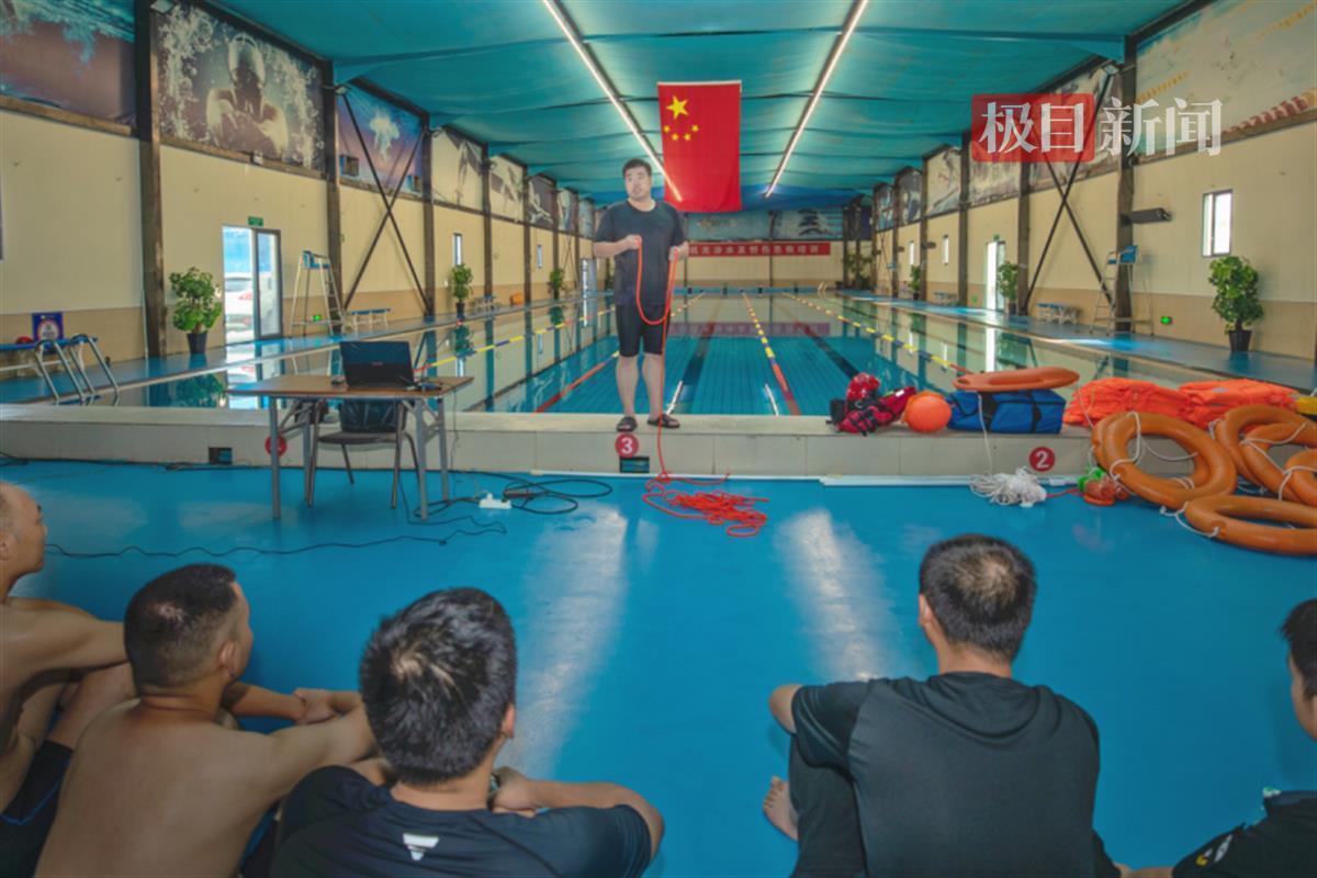 在游泳馆,市级教官、交管局车管所副所长、二级警长刘思杰现场培训救生杆、救生圈、救生绳、救生衣等救援器材规范操作,并下水操作展示涉水救援处置流程、救援器材使用等专业技能。