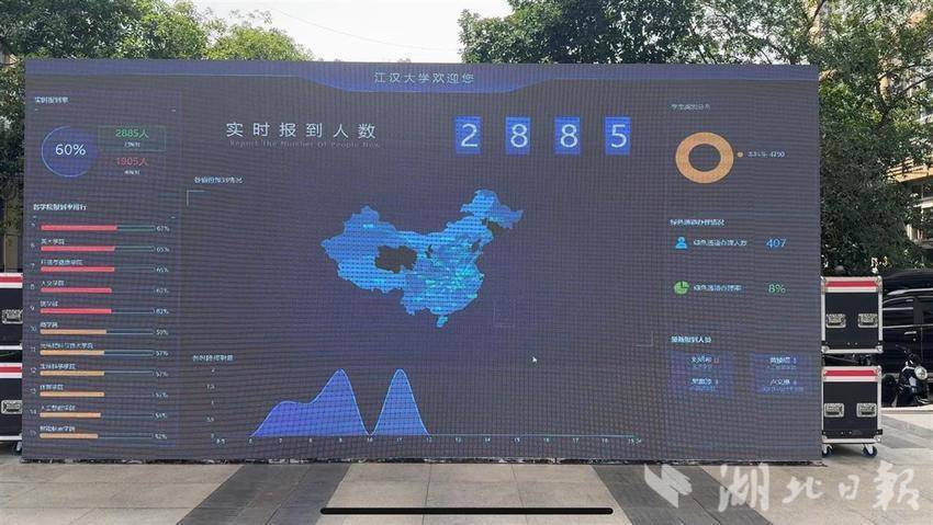 在江汉大学新生报到入口,摆放着三台机器,在志愿者的引导下,学生刷一下脸,便能迅速确认是否是该校的新生。同时,一块大屏上,正实时显示着报道新生的人数、来源地等信息。据介绍,这些系统不但能确保新生入学的快速和安全,还能方便班主任、辅导员掌握新生报到动向,帮助学生更好入学。