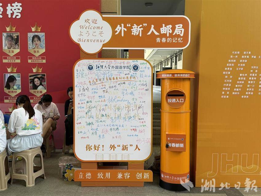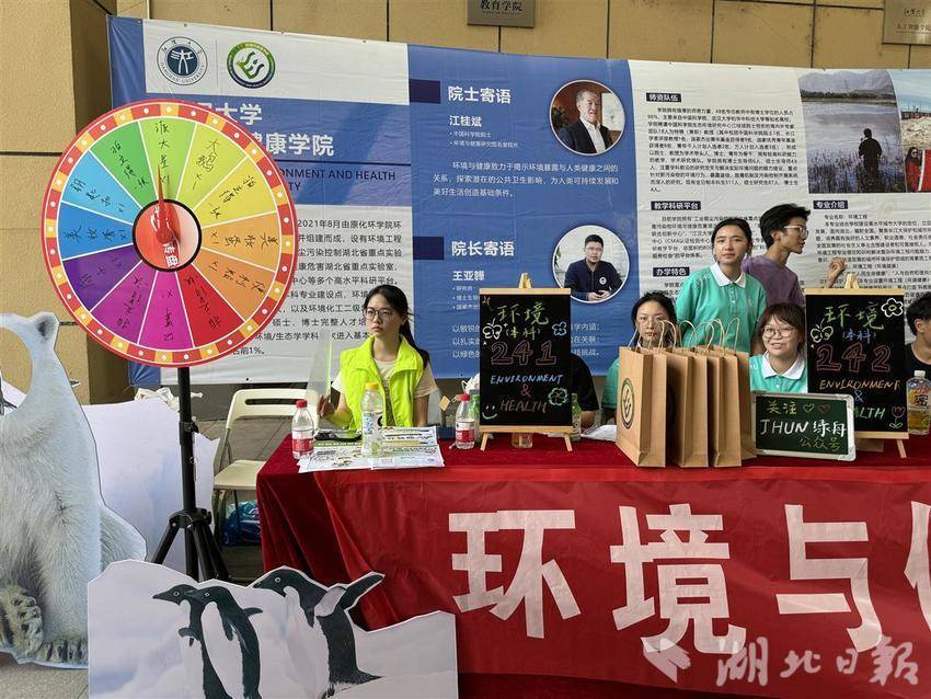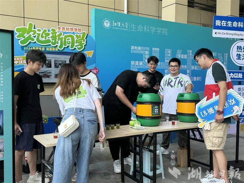 一大早,江汉大学的志愿者们,就奔赴武昌、汉口、武汉火车站、体育中心地铁站等交通枢纽迎接新生,让新生们一到武汉便感受到学校的温暖,同时,在学校一号门、五号门门口也安排了志愿者和摆渡车,引导新生报到。到校后,新生们不仅会遇到热心的学长、学姐引导,还会有各种小“惊喜”。生命科学学院为把专业成果变为绿藻茶、鲜榨啤酒,请新生和家长免费品尝;文学学院的非遗社团不仅展示了我省的非遗成果,还准备了扇面画,让新生亲手体验,“我对非遗一直很感兴趣,体验了一下感觉挺有趣。”金融专业的新生吴彩琴说;环境与健康学院摆出了幸运大转盘,每位新生可随机获得一份礼物。