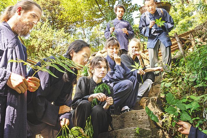 8月19日上午,在白马山天马峰,外国学员们在杜师父的指导下辨认中草药,学习中医知识。