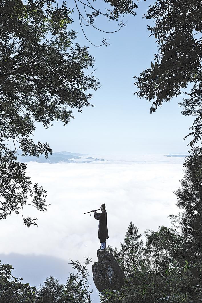 8月19日,在白马山天马峰顶,波兰人达瑞兹面对山谷间的云海练习洞箫。