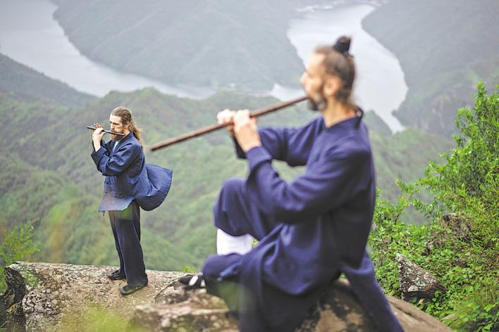 8月10日,十堰市白马山天马峰顶,爱尔兰小伙艾伦(左)和来自波兰的达瑞兹(右)面对山谷练习洞箫和竹笛。