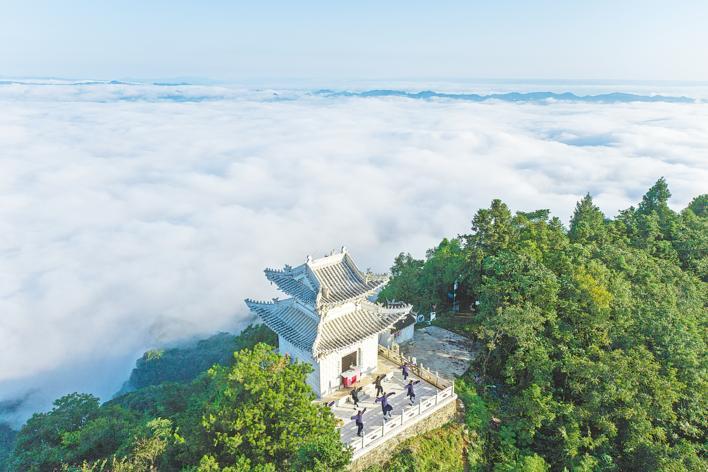 8月19日清晨,在白马山天马峰顶,学员们迎着朝阳练习功夫。