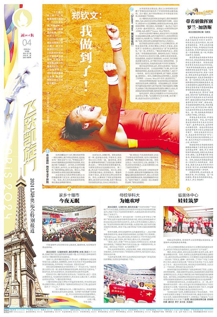 郑钦文代表亚洲首夺奥运会网球女单冠军,手记《带着骄傲挥别罗兰·加洛斯》,反映场上运动员顽强拼搏的风采和场下记者奋力报道历史突破的不易。手记《最美妙的巴黎,是奥运的巴黎》诠释巴黎奥运场馆从选址到设计的浪漫主义色彩。湖北健儿赛事收官,恰逢七夕,手记《离别在七夕的巴黎》呈现本届奥运会的独有魅力。