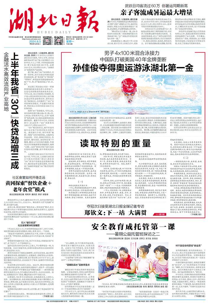 此时是北京时间凌晨1点多,编辑部已完成组版。我马上乘出租车赶往赛场,途中,一边通知后方预留1版位置,一边写稿。因游泳场馆在郊外,加上司机路线不熟,我中途下车寻求巴黎警方帮助才及时赶到,找到了刚完成尿检的孙佳俊。结束专访后,我联系编辑部,在稿件中澄清了孙佳俊是凭实力跻身第三棒,而并非临时顶替上场,最终抢出了湖北日报8月5日头版独家消息《孙佳俊夺得奥运游泳湖北第一金》。