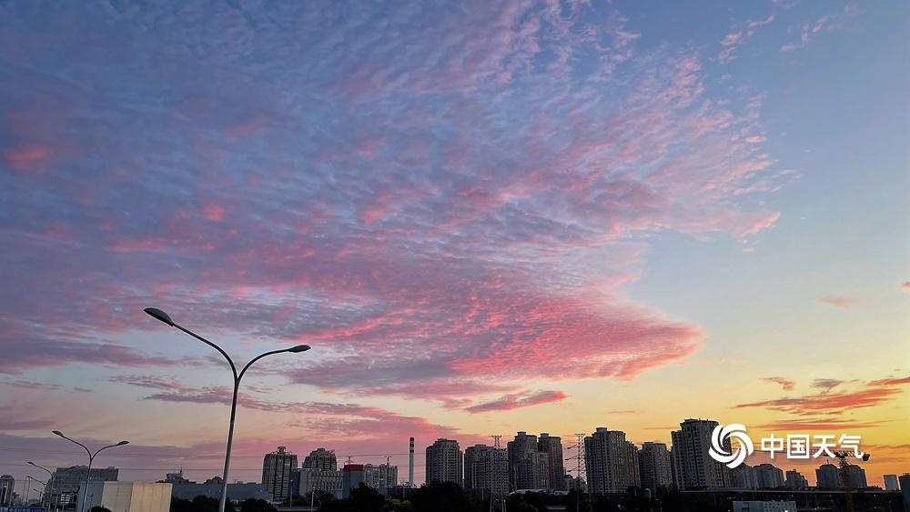 今晨(8月28日),北京朝霞和鱼鳞云扮靓天空。鱼鳞云也叫“透光高积云”,往往预示着晴好天气将持续。根据预报,未来三天,北京以晴为主,白天紫外线强,公众请注意防晒。(来源:中国天气)