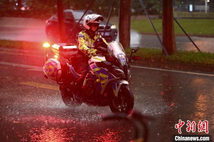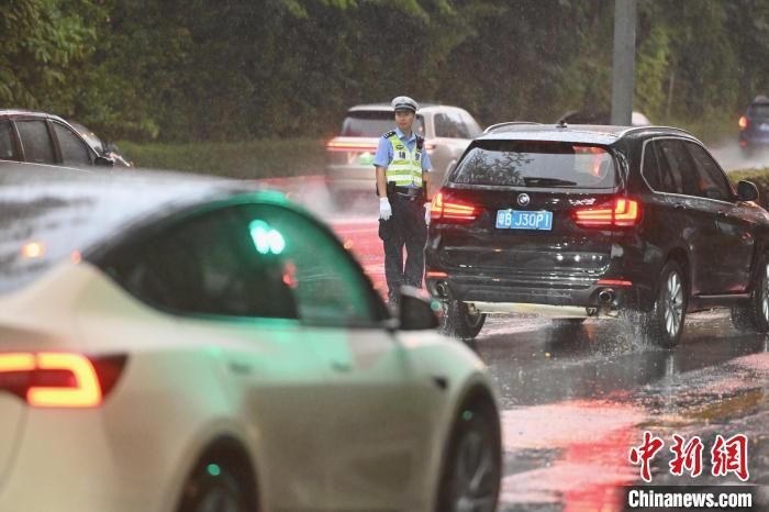 图为深圳交警冒雨执勤。中新社记者 陈文 摄