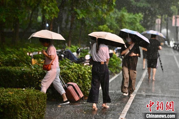 深圳市气象台8月28日17时33分在南山区、宝安区、珠江口和深圳湾海域发布雷雨大风橙色预警信号,预计未来1-2小时上述区域有强雷雨天气,有短时强降水和10级左右阵风,局部可能出现龙卷,并伴有强雷电。图为深圳市民冒雨出行。中新社记者 陈文 摄